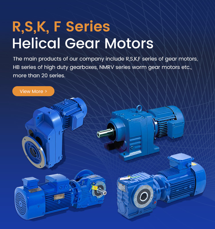 The main products of our company include R,S,K,F series of gear motors, HB series of high duty gearboxes, NMRV series worm gear motors etc., more than 20 series.